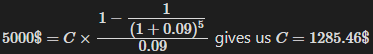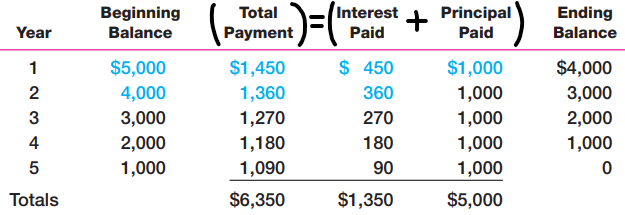 - ex) borrowing 5000 for 5 years at 9% interest, Interest paid of each year is beginning balance multiplied by 9%